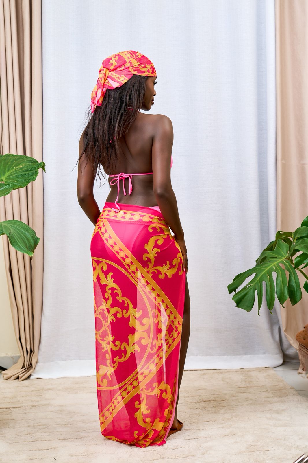 This four-piece set includes a Brazilian bikini featuring a side wrap and a coordinating head wrap. Made from a blend of spandex and polyester, the fabric is breathable, quick-drying, and non-toxic. The bikini also has removable padding and antibacterial properties to ensure comfort and hygiene.